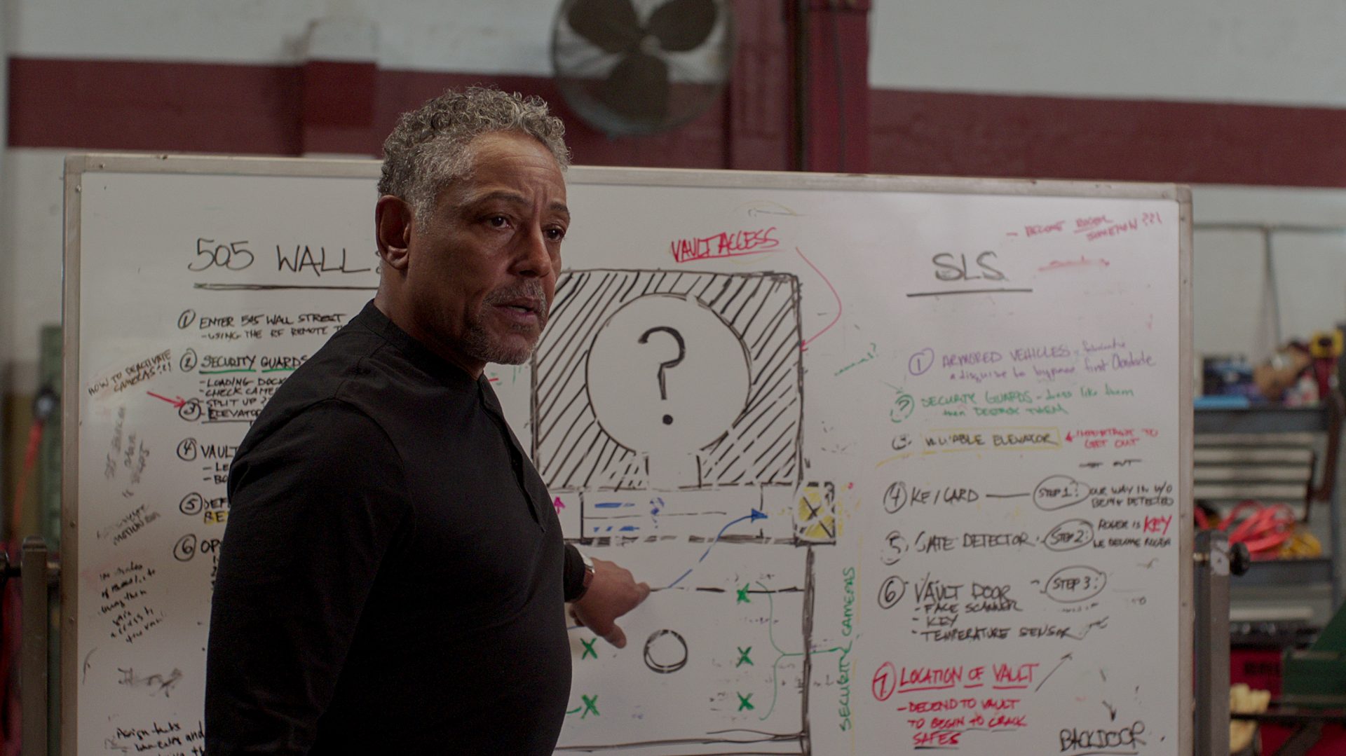 White showed the actual heist. The group got into SLS, tricked the gait detector with bees, and used the storm to fool the temperature barrier. Leo even used a face mask to show the machine that he was Salas.ย
