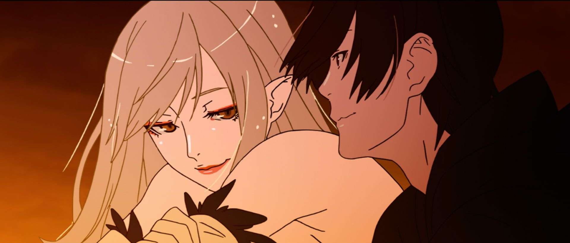 Even though Kiss-shot Acerola-Orion Heart-under-blade (Maaya Sakamoto) is not exempt from this treatment, her characterization drives Koyomi’s arc forward and not the other way around, and the layers of hunger, savagery, erotic need, and ultraviolence that define her motivations emerge as the beating heart of this tale. It is no wonder that a traumatized Koyomi throws his life away after glimpsing Kiss-shot in the subway for the first time: limbs dismembered, platinum-blonde hair alight, mesmerizing eyes clawing into the depths of his soul, as she begs him to let her drain him of blood. There’s no discernible logic to Koyomi’s sacrifice, but there doesn’t need to be one, as he has experienced a kind of beauty and terror so viscerally lifechanging that he’s ready to walk back to her and offer his throat as a banquet, without regrets.