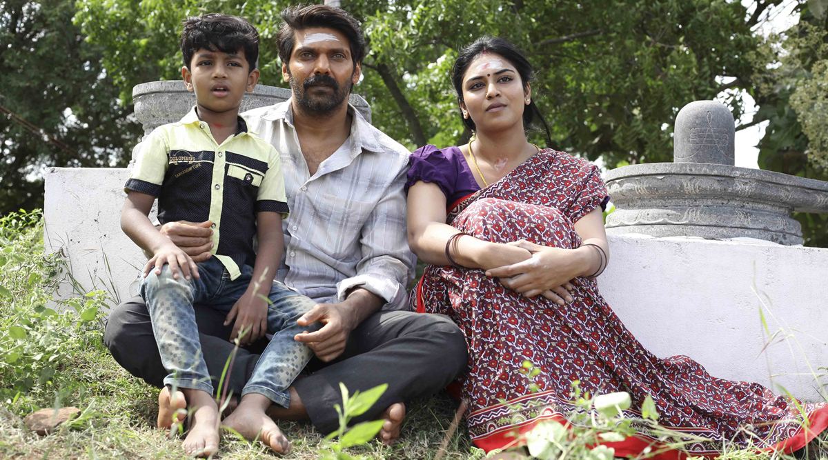 Maga drives a taxi. He lives with his wife (Indhuja) and a little boy, and burdened by financial problems any typical member of the unorganized, urban labor force might face. When he hears that a teacher has hit his boy for no valid reason, Maga’s wife demands a vigorous response from him. But he calmly waits in front of the principal’s office with his boy, a soothing portrait of Jesus holding a child in the background, and then persuasively talks to the principal on why he should shun this kind of behavior from teachers. If Maga’s life and the atmosphere feel a bit constrained, Muni, as his name implies, lives like a sage. He does organic farming in a remote village, reads a lot, and bestows education to kids who aren’t privileged enough to receive it. If Maga is pragmatic enough in the life he leads, Muni is all about forging a new path in life, while evoking deeper questions about spirituality, caste, karma, mankind, etc.